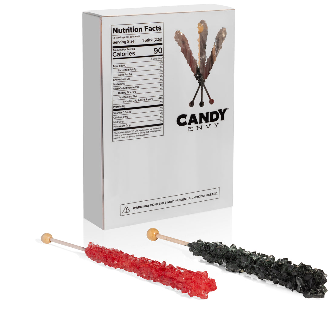 Ignite your taste buds with Candy Envy's Black and Red Rock Candy! Each stick features individually wrapped crystal candy, offering a delightful combination of colors and flavors. Perfect for sports events, or themed celebrations, this candy is a favorite among sports fans, gothic enthusiasts, and those who appreciate bold and vibrant treats. Add a touch of excitement to your gatherings or enjoy them as a personal indulgence. Experience the irresistible allure of Candy Envy's Black and Red Rock Candy and let your taste buds dance with joy.