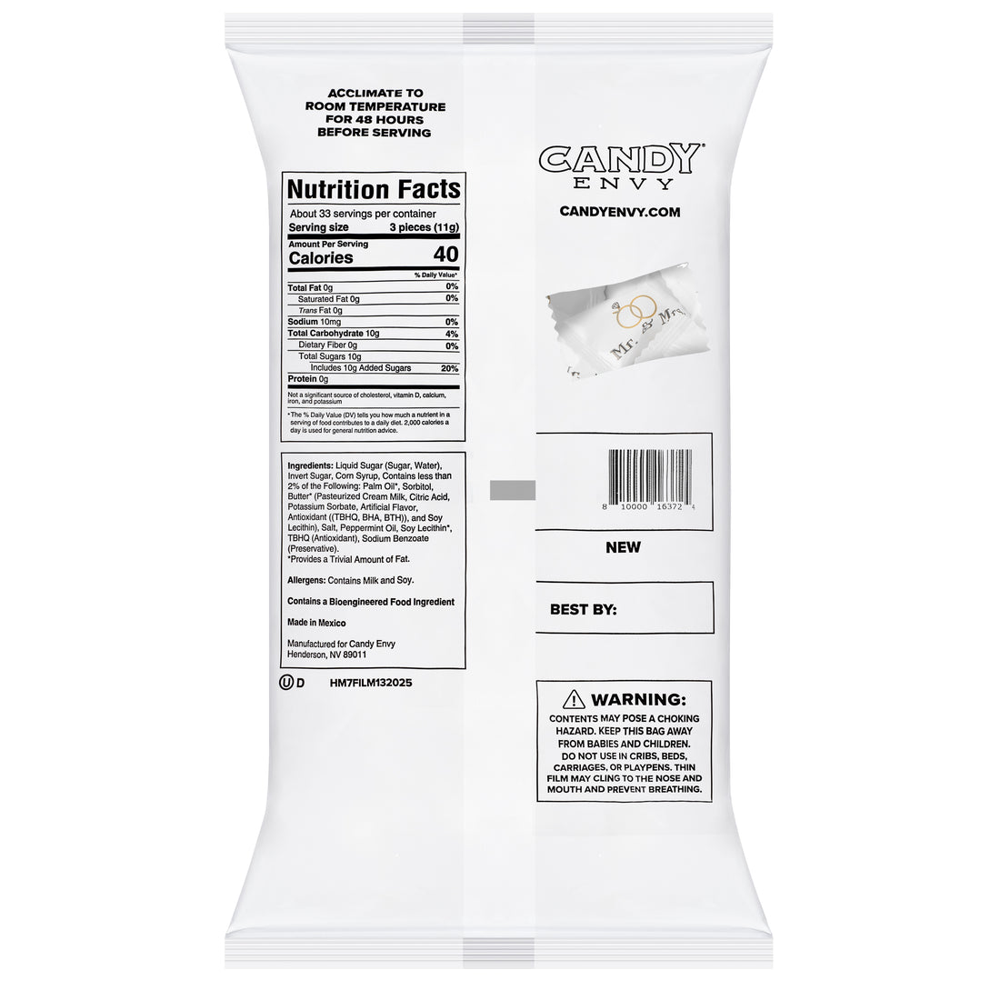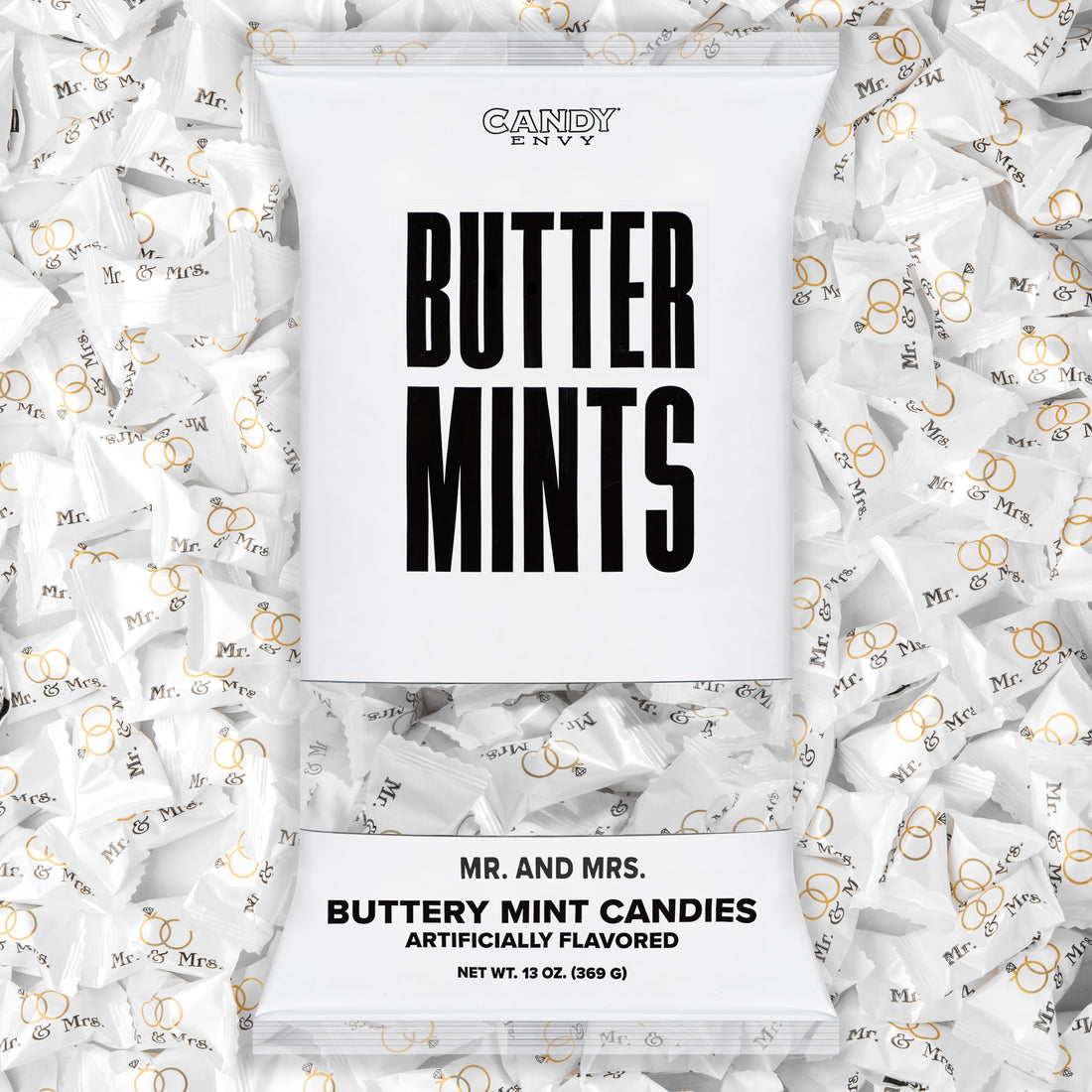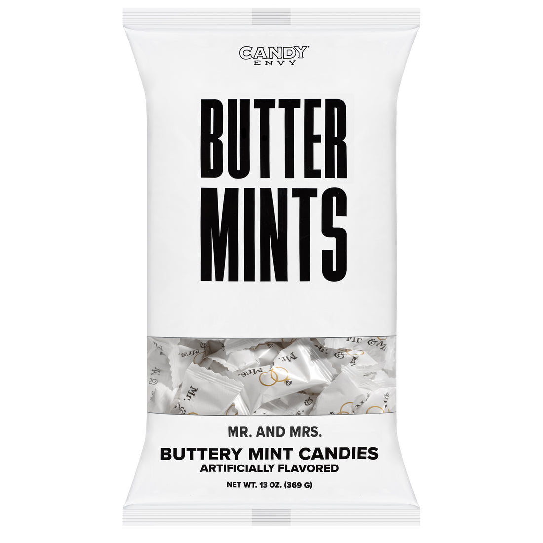 - INDIVIDUALLY WRAPPED Buttermints, in "Mr. & Mrs." printed White wrappers with 2 rings - Individually wrapped for freshness, your safety, and ease of sharing.