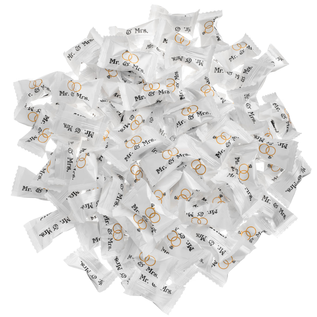 Announce your union in sweet style with these fun little printed mints. Each individually wrapped buttermint is printed with "Mr. & Mrs." above a pair of gold rings. Our best buttermints allow you about a 105, or so, opportunities to share your excitement, with every ~13 oz. bag.